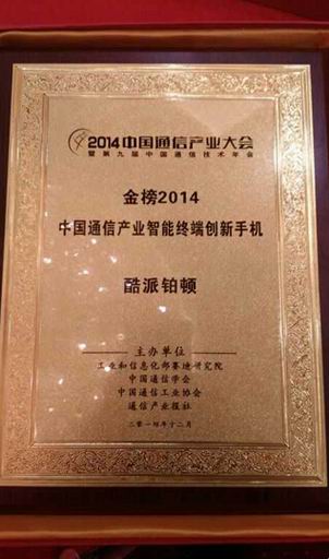 12月30日,2014中国通信产业大会暨第九届中国通信技术年会在北京召开,大会主题为“新常态 新网络 新机遇”,工信部领导、国内外运营商以及产业链多方代表都出席了本届会议,共同交流探讨在新常态下通信产业发展的创新和共赢之路,并回顾了过去一年中产业发展所取得的辉煌成就。酷派铂顿凭借在信息安全技术上的创新突破,获得了手机产品最高殊荣--“2014年中国通信产业智能终端创新手机”大奖,成为本届大会的最大赢家。